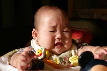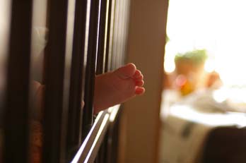 『ベビーベッドから出た足』